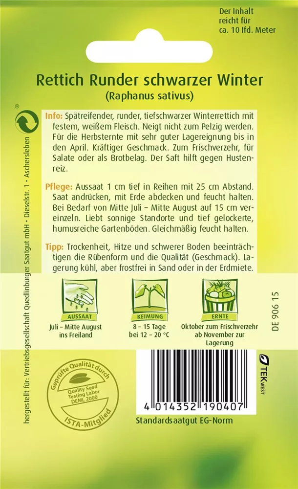 Die schwarzen Wurzeln haben einen scharfen Geschmack. Reifezeit ab Oktober.Die Wurzeln sind rund.
