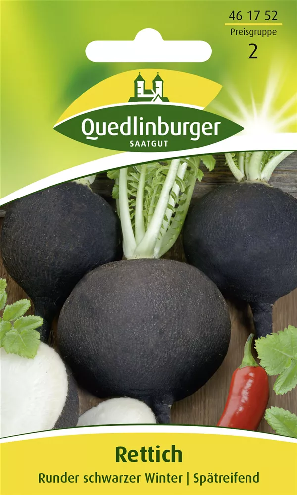 Der Rettich 'Runder schwarze Winter' (Raphanus sativus var. niger) bildet Wurzeln, die scharf schmecken und bereits ab Oktober geerntet werden können. Für das optimale Wachstum des Rettichs 'Runder schwarzen Winter' werden ein sonniger Standort und durchlässiger, nährstoffreicher Boden benötigt.