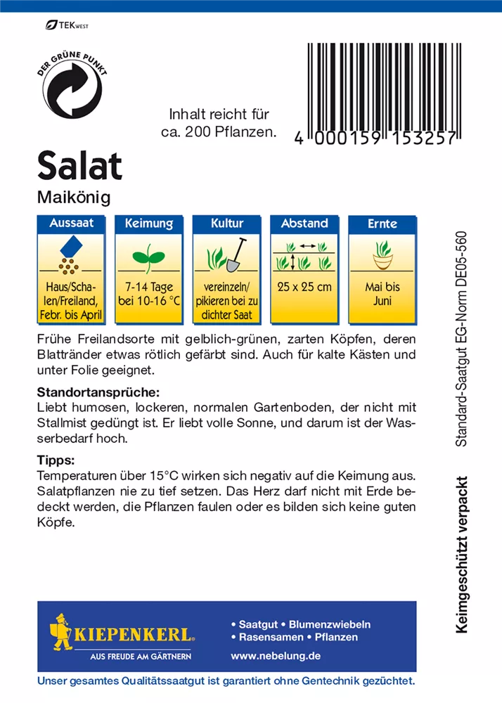 Samen 0,5 - 1 cm mit Erde bedecken. Die Keimung erfolgt innerhalb von 7 - 14 Tagen bei 10 - 16°C Bodentemperatur.