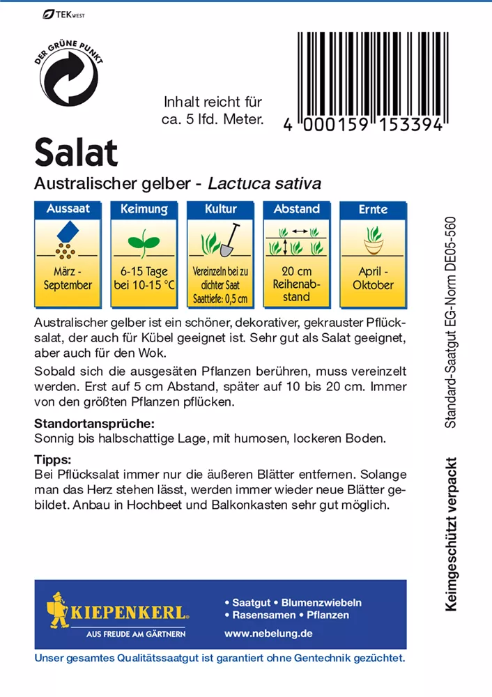 Die Pflücksalat 'Australische Gele' (Lactuca sativa) ist eine aromatisch, nussig, bitter schmeckende Gemüsepflanze. Ihre Blätter können geerntet werden, sobald sie ca. 20 erreicht hat. Für das optimale Wachstum der Pflücksalat 'Australische Gele' werden ein sonniger Standort und durchlässiger, nährstoffreicher Boden benötigt.