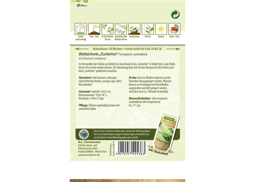 Die Zichorie 'Zuckerhut' (Cichorium intybus) ist eine bitter, aromatisch schmeckende Gemüsepflanze. Ihre Blätter können geerntet werden, sobald sie ca. 30 erreicht hat. Für das optimale Wachstum der Zichorie 'Zuckerhut' werden ein sonniger Standort und durchlässiger, nährstoffreicher Boden benötigt.