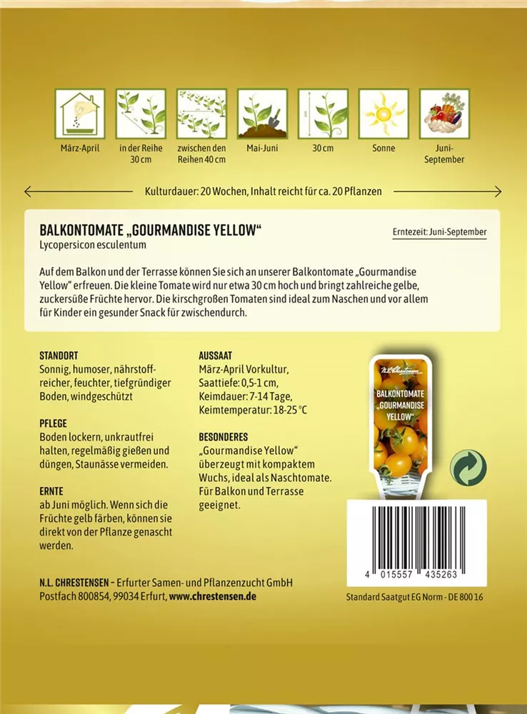 Die Balkon-Tomate 'Gourmandise Yellow' (Solanum lycopersicum) bildet kleine Früchte, die aromatisch, süß schmecken und bereits ab Juni geerntet werden können. Für das optimale Wachstum der Balkon-Tomate 'Gourmandise Yellow' werden ein sonniger Standort und durchlässiger, nährstoffreicher Boden benötigt.