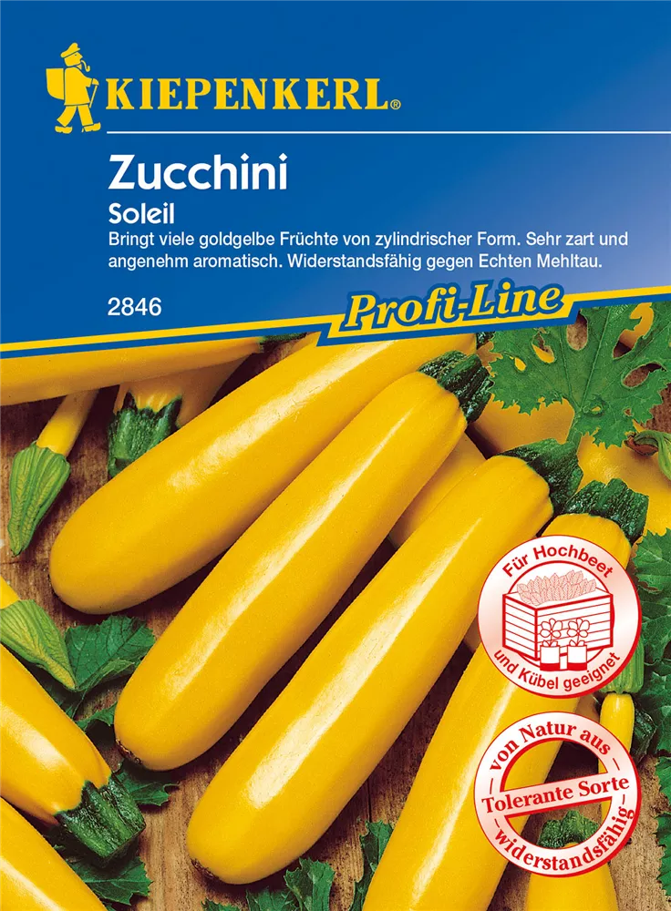 Die Zucchini 'Soleil F1' (Cucurbita pepo) bildet Früchte, die aromatisch schmecken und bereits ab Juli geerntet werden können. Für das optimale Wachstum der Zucchini 'Soleil F1' werden ein sonniger Standort und durchlässiger, nährstoffreicher Boden benötigt.