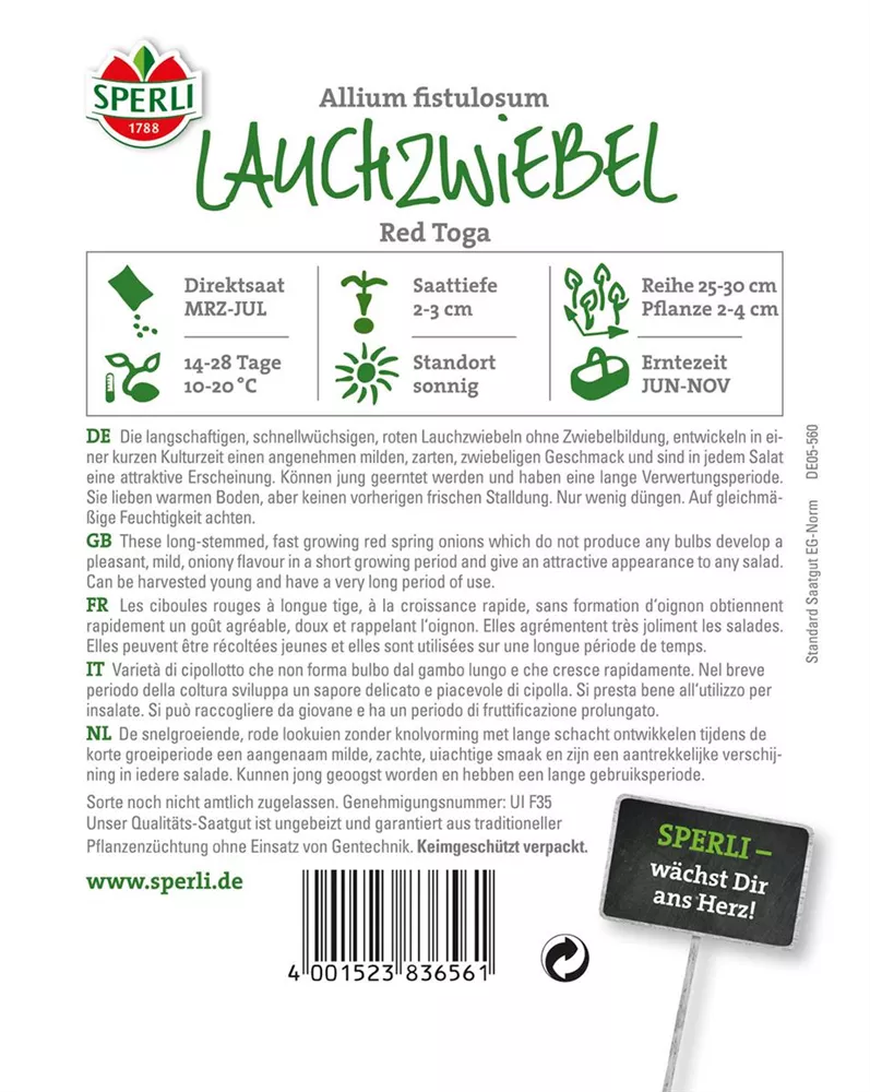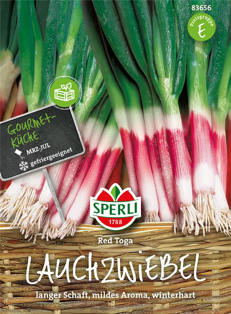 Die Lauchzwiebel 'Red Toga' (Allium fistulosum) ist eine Kräuterpflanze mit einem aromatischen, würzigen, milden Geschmack. Ihre grau-grünen Blätter sind rundlich. Für das optimale Wachstum der Lauchzwiebel 'Red Toga' werden ein sonniger Standort und durchlässiger, nährstoffreicher Boden benötigt.