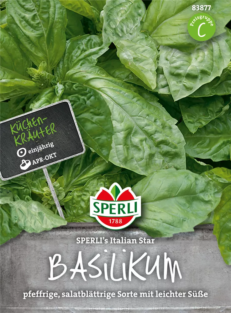 Das Basilikum 'Italian Star' (Ocimum basilicum) ist eine Kräuterpflanze mit einem würzigen Geschmack. Seine mittelgrünen Blätter sind eiförmig und gewellt. Für das optimale Wachstum des Basilikums 'Italian Star' werden ein sonniger Standort und durchlässiger, nährstoffreicher Boden benötigt.