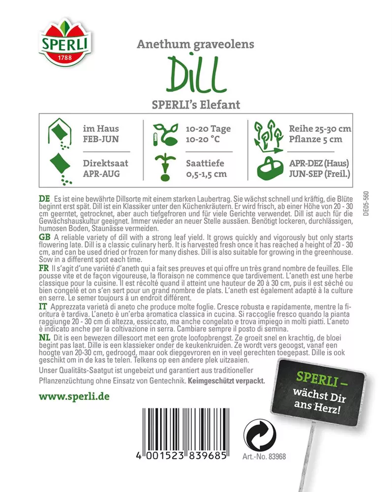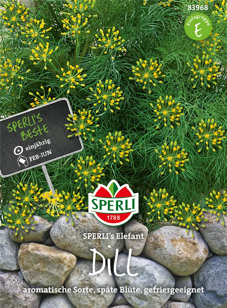 Der Dill 'Elefant' (Anethum graveolens) ist eine Kräuterpflanze mit einem würzigen Geschmack. Seine grünen Blätter sind tief geschlitzt. Für das optimale Wachstum des Dills 'Elefant' werden ein sonniger Standort und durchlässiger, nährstoffreicher Boden benötigt.