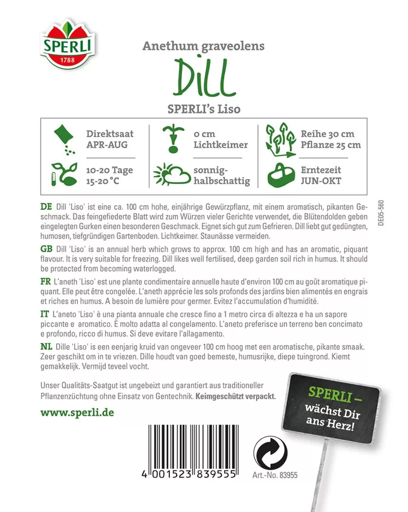 Der Dill 'Liso' (Anethum graveolens) ist eine Kräuterpflanze mit einem würzigen Geschmack. Seine grünen Blätter sind tief geschlitzt. Für das optimale Wachstum des Dills 'Liso' werden ein sonniger Standort und durchlässiger, nährstoffreicher Boden benötigt.