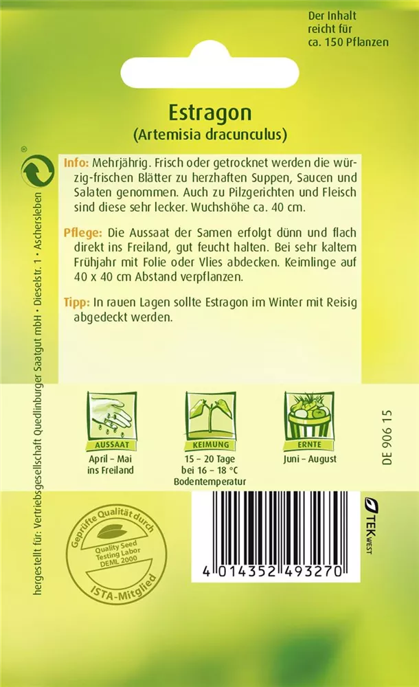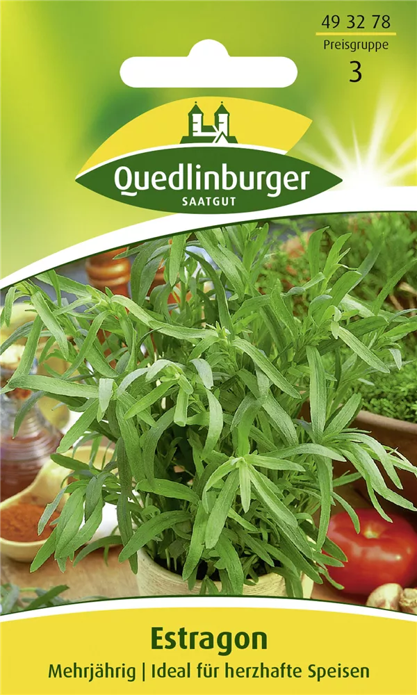 Der Estragon (Artemisia dracunculus) ist eine Kräuterpflanze mit einem würzigen Geschmack. Seine mittelgrünen Blätter sind gefingert. Für das optimale Wachstum des Estragons werden ein sonniger Standort und durchlässiger, nährstoffreicher Boden benötigt.