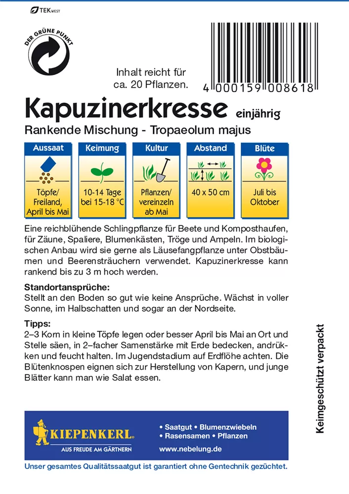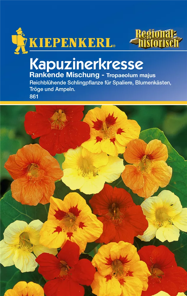 Die Kapuzinerkresse 'Rankende Mischung' (Tropaeolum majus) ist eine beliebte Pflanze für den Balkon. Die unzähligen Blüten erscheinen, je nach Sorte, in verschiedenen Farben die ganze Saison hindurch. Ein sonniger bis halbschattiger Standort und ein durchlässiges Substrat werden bevorzugt.