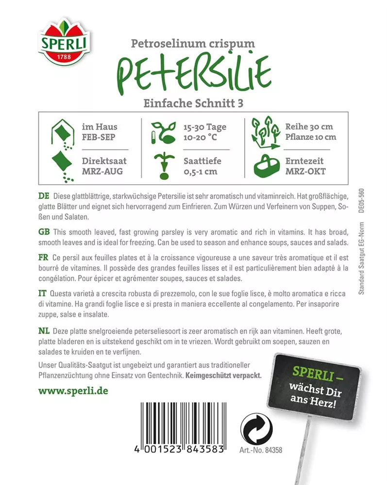 Die Glattblättrige Petersilie 'Einfache Schnitt 3' (Petroselinum crispum) ist eine Kräuterpflanze mit einem aromatischen, würzigen Geschmack. Für das optimale Wachstum der Glattblättrige Petersilie 'Einfache Schnitt 3' werden ein sonniger Standort und durchlässiger, nährstoffreicher Boden benötigt.