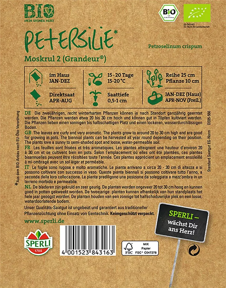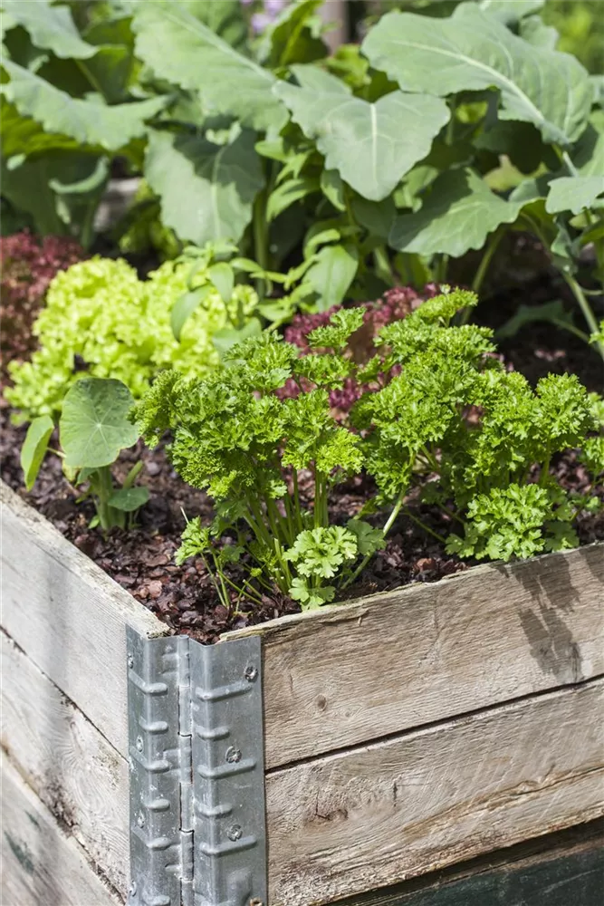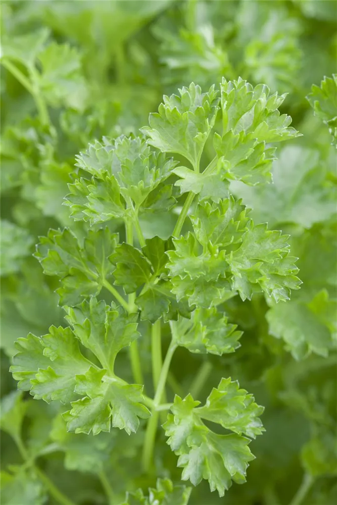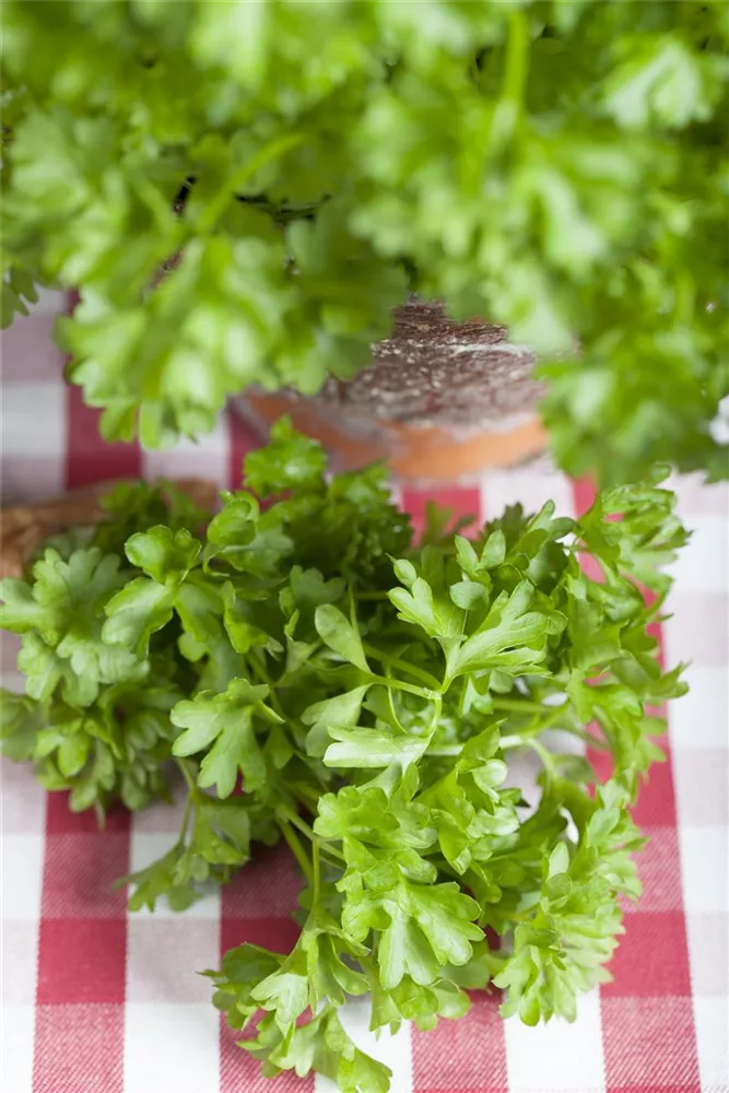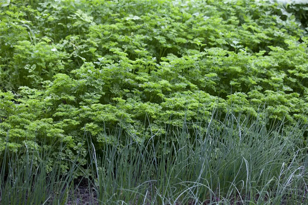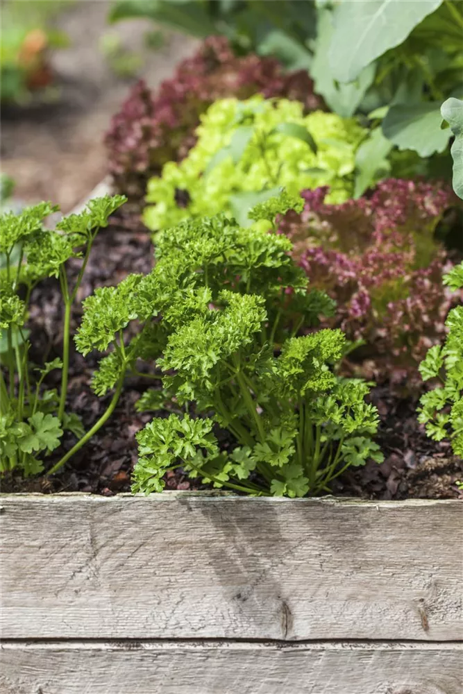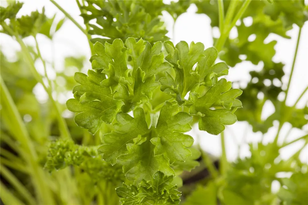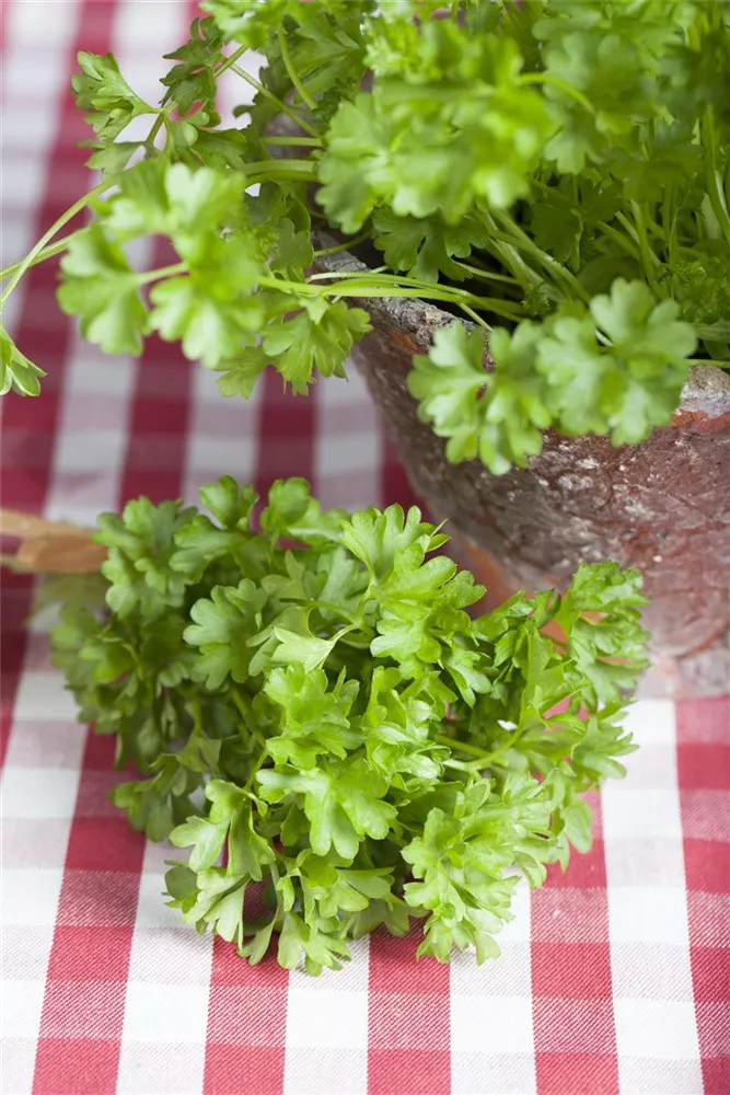 Die Krause Petersilie (Petroselinum crispum) ist eine Kräuterpflanze mit einem aromatischen Geschmack. Ihre dunkelgrünen Blätter sind gefiedert und gewellt. Für das optimale Wachstum der Krause Petersilie werden ein sonniger Standort und durchlässiger, nährstoffreicher Boden benötigt.