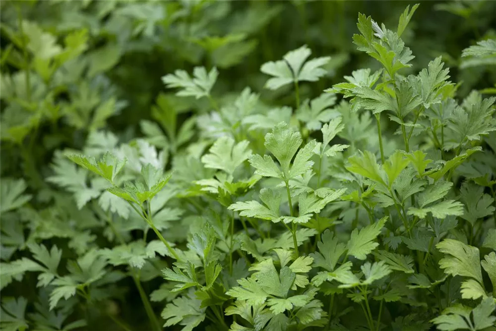 Zum Verzehr geeignet. Die dunkelgrünen, gewellten Blätter sind gefiedert und überzeugen mit aromatischem Geschmack.