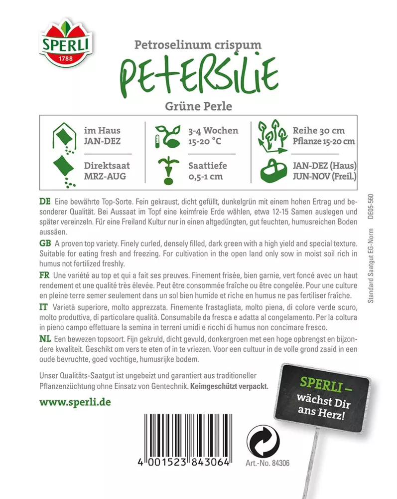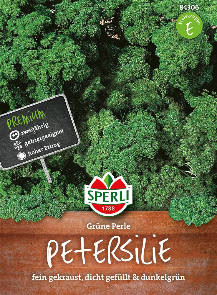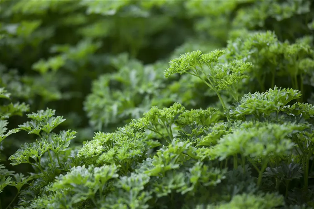 Die Krause Petersilie 'Grüne Perle' (Petroselinum crispum) ist eine Kräuterpflanze mit einem aromatischen, würzigen Geschmack. Ihre dunkelgrünen Blätter sind gefiedert und gewellt. Für das optimale Wachstum der Krause Petersilie 'Grüne Perle' werden ein sonniger Standort und durchlässiger, nährstoffreicher Boden benötigt.