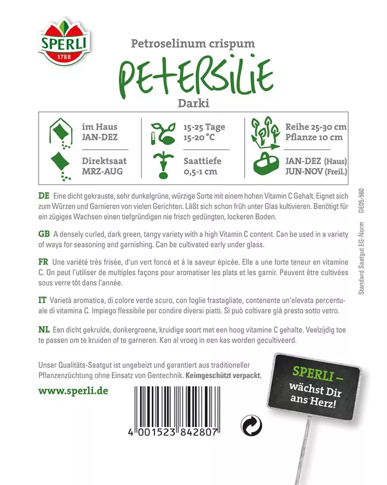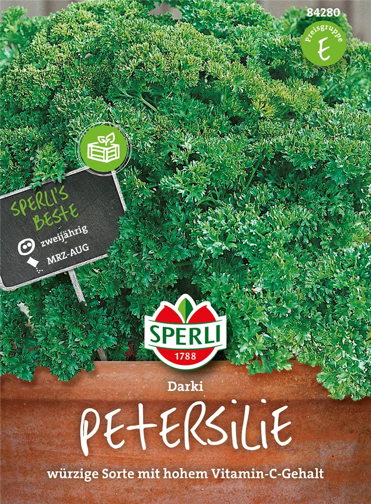 Die Petersilie 'Darki' (Petroselinum crispum) ist eine Kräuterpflanze mit einem aromatischen Geschmack. Ihre dunkelgrünen Blätter sind gefiedert und gewellt. Für das optimale Wachstum der Petersilie 'Darki' werden ein sonniger Standort und durchlässiger, nährstoffreicher Boden benötigt.
