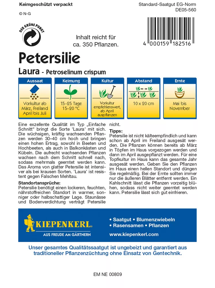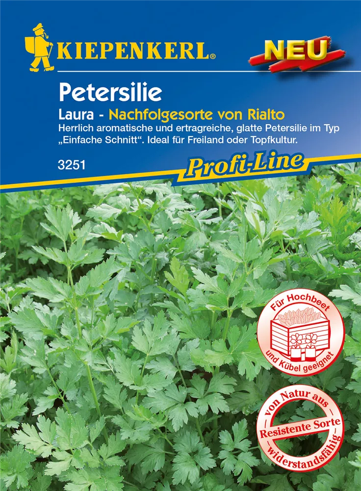 Die Petersilie 'Laura' (Petroselinum crispum) ist eine Kräuterpflanze mit einem aromatischen Geschmack. Ihre dunkelgrünen Blätter sind gefiedert und gesägt. Für das optimale Wachstum der Petersilie 'Laura' werden ein sonniger Standort und durchlässiger, nährstoffreicher Boden benötigt.