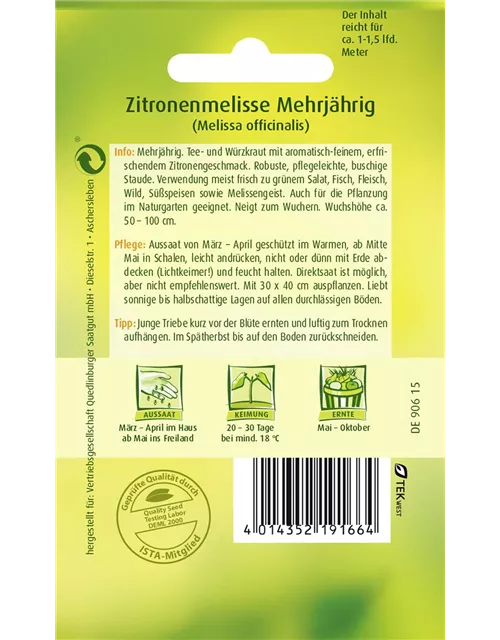 Die Zitronen-Melisse (Melissa officinalis) ist eine angenehm duftende Kräuterpflanze mit einem aromatischen Geschmack. Ihre hellgrünen Blätter sind eiförmig und gesägt. Für das optimale Wachstum der Zitronen-Melisse werden ein sonniger Standort und durchlässiger, nährstoffreicher Boden benötigt.