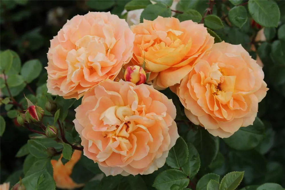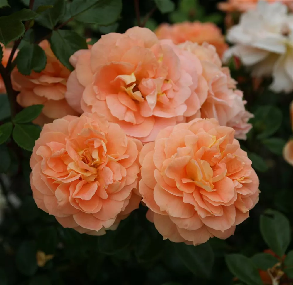 Rosa 'Schöne vom See'® bringt von Juni bis September rote, gelbe, weiße, rosafarbene, apricotfarbene, starkgefüllte, schalenförmige, in Dolden angeordnete Blüten hervor. Diese werden etwa 7 - 9 cm groß.