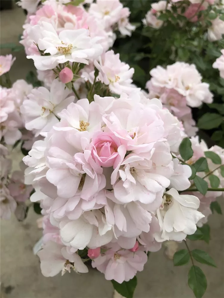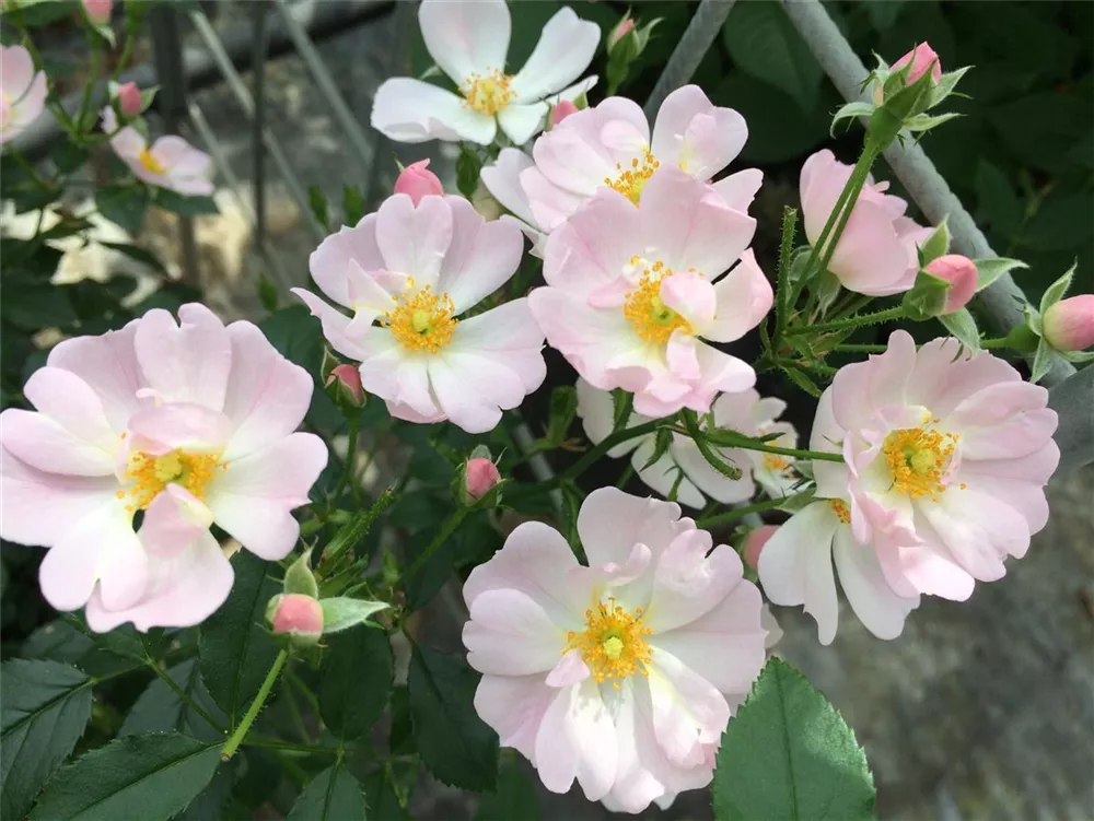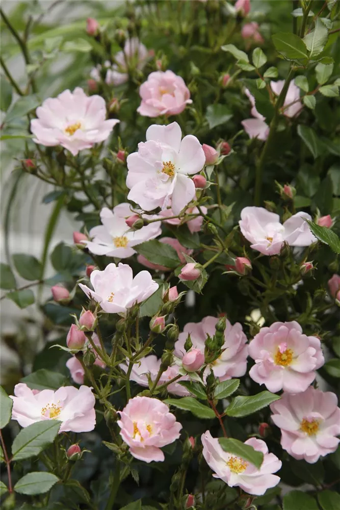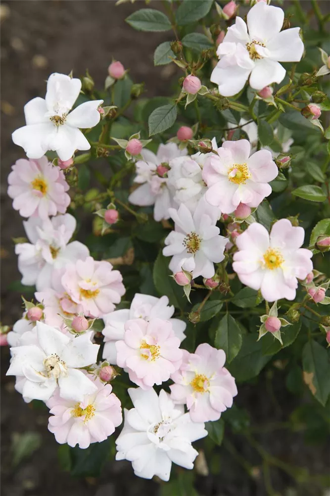 Die Zwergrose 'Sternenhimmel'® (Rosa) ist eine reichblühende Rose, die im Garten eine besondere Rolle spielt. Die zahlreichen Blüten sind hellrosa und erscheinen von Juni bis Oktober. Ihr wunderbarer Duft entfaltet sich besonders an sonnigen, warmen Tagen. Mit den richtigen Begleitern an ihrer Seite, kommt die Königin der Blumen besonders gut zur Geltung. Niedrige Stauden, Lavendel und Salbei eignen sich ganz gut für diese Zwecke.