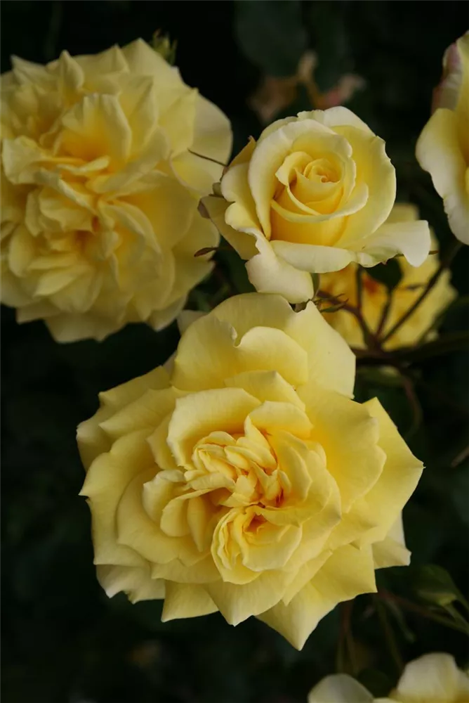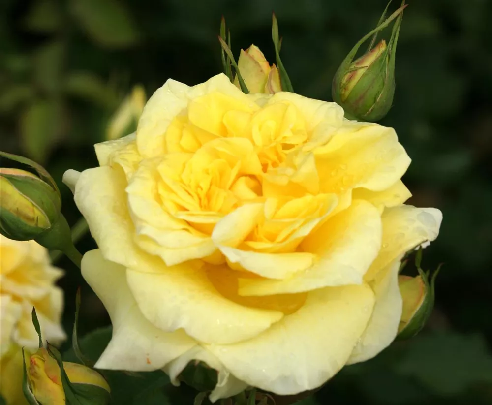 Die Edelrose 'Sterntaler'® (Rosa) ist eine reichblühende Rose, die im Garten eine besondere Rolle spielt. Die zahlreichen starkgefüllten Blüten sind gelb und erscheinen von Juni bis Oktober. Ihr wunderbarer Duft entfaltet sich besonders an sonnigen, warmen Tagen. Mit den richtigen Begleitern an ihrer Seite, kommt die Königin der Blumen besonders gut zur Geltung. Niedrige Stauden, Lavendel und Salbei eignen sich ganz gut für diese Zwecke.