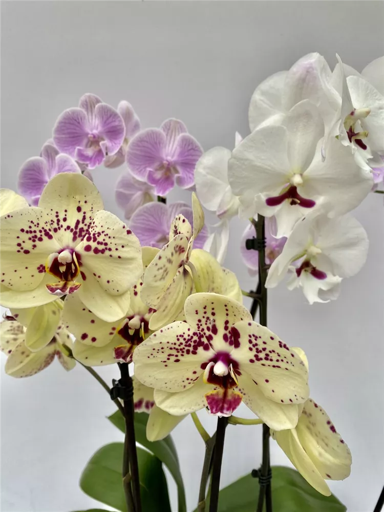 Wir senden Ihnen eine Phalaenopsis, die mindestens zwei aufgeblühte Rispen hat. Den Versand überstehen die Blüten in der Regel unbeschadet.