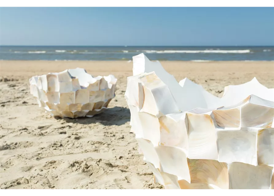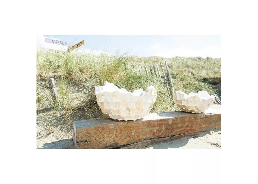 Echte, in Handarbeit aufgebrachte Muscheln machen die Produkte der Serie zu einem exklusiven und schimmerndem Highlight in jeder Dekoration. Mit großem Aufwand und in Präzision werden die drei- und rechteckigen Muschelstücke aus weißem, braunem oder schwarzem Perlmutt auf den Korpus der Artikel aufgebracht, bevor sie verfugt und abschließend noch einmal überarbeitet werden. Zu der Serie gehören neben je vier Pflanzgefäßen in verschiedenen Formen und Größen, auch Schalen, Tischgefäße, Säulen und Orchideentöpfe und geben Ihnen somit die Möglichkeit, die Muschel-Gefäße als stimmungsvolles und exklusives Gesamtkonzept anzubieten.
