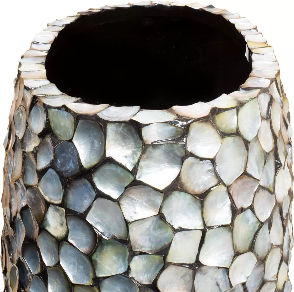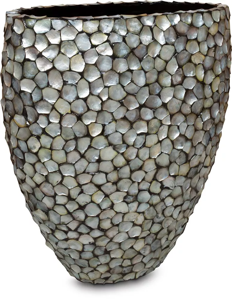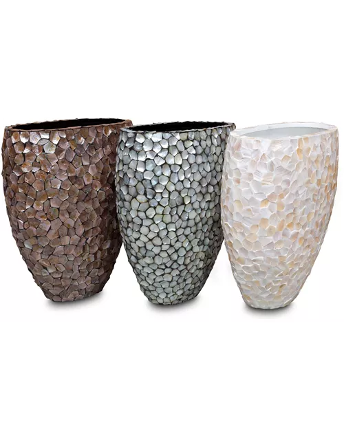 Echte, in Handarbeit aufgebrachte Muscheln machen die Produkte der Serie zu einem exklusiven und schimmerndem Highlight in jeder Dekoration. Mit großem Aufwand und in Präzision werden die drei- und rechteckigen Muschelstücke aus weißem, braunem, schwarzem oder silber-blauem Perlmutt auf den Korpus der Artikel aufgebracht, bevor sie verfugt und abschließend noch einmal überarbeitet werden. Zu der Serie gehören neben je vier Pflanzgefäßen in verschiedenen Formen und Größen, auch Schalen, Tischgefäße, Säulen und Orchideentöpfe und geben Ihnen somit die Möglichkeit, die Muschel-Gefäße als stimmungsvolles und exklusives Gesamtkonzept anzubieten.