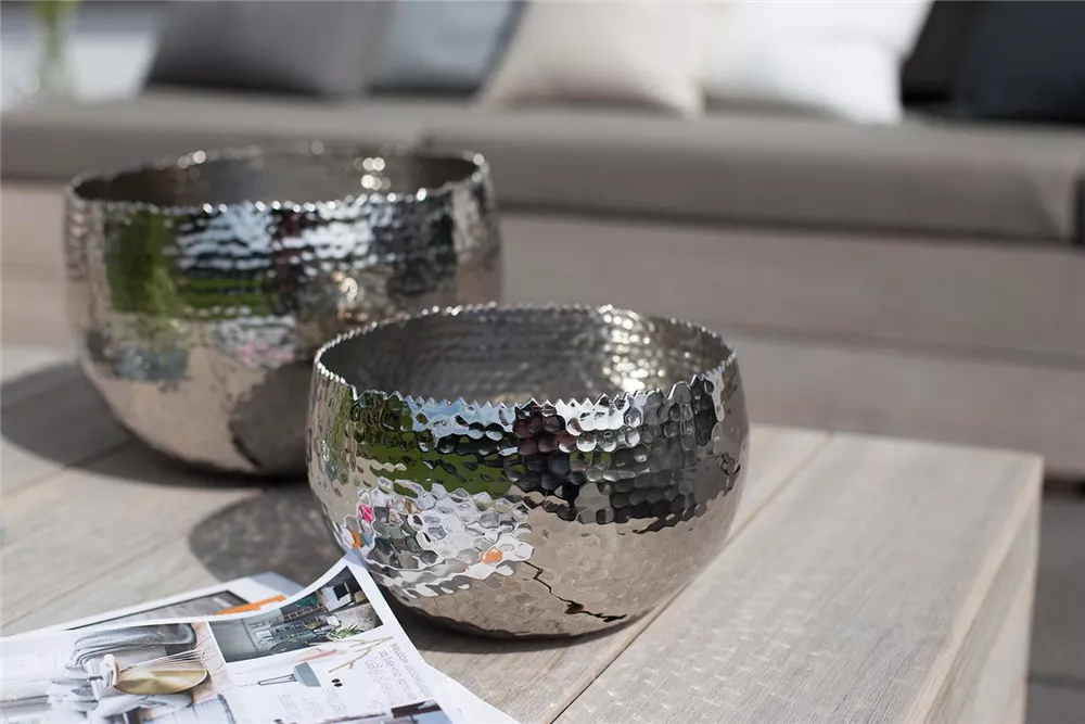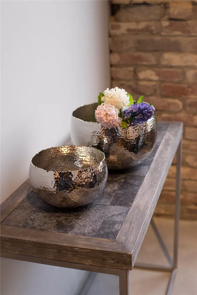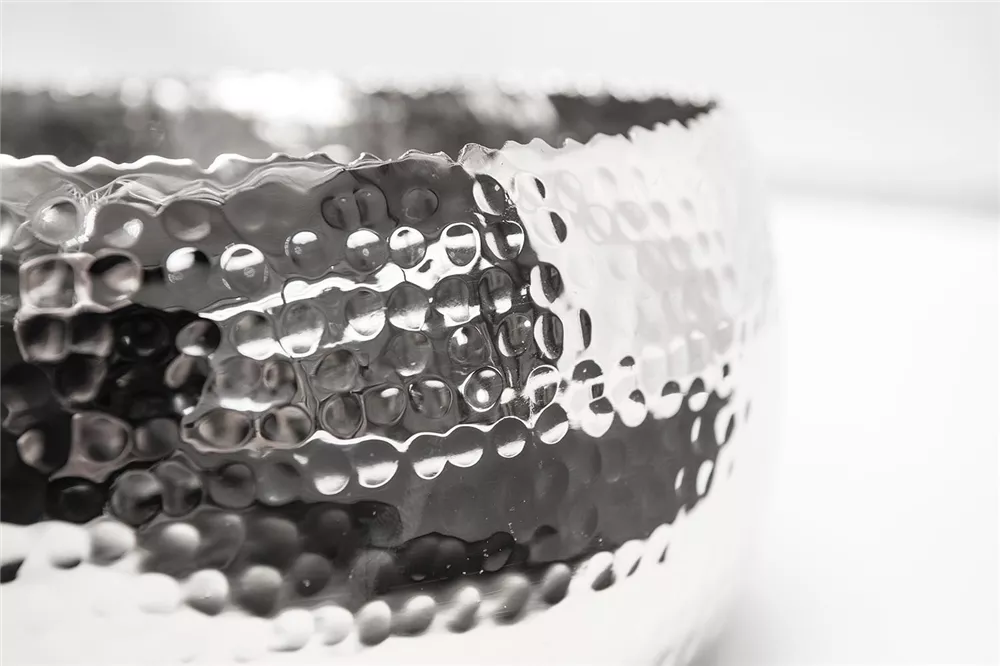Weiche Konturen, eine glänzende Oberfläche sowie eine dezente Hammerschlagoptik: die hübsche Schale wird per Hand aus Aluminium gefertigt und ist eine tolle Bereicherung für Ihr Interieur.